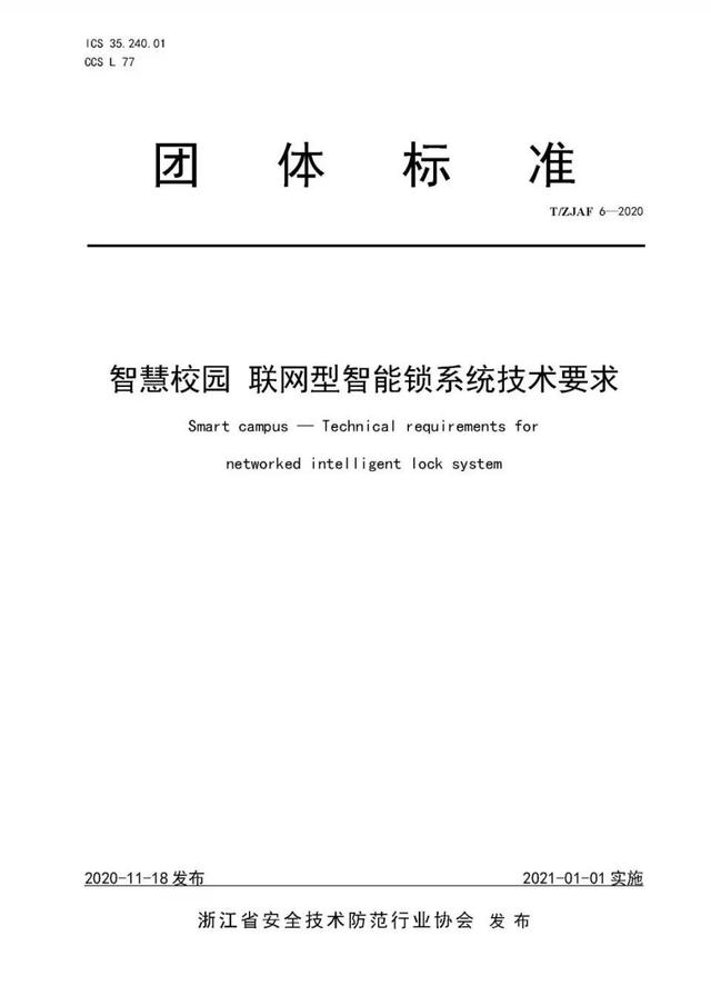 2020年11月18日,由掌门物联科技(杭州)股份有限公司、浙江正元智慧科技股份有限公司等单位起草的《智慧校园联网型智能锁系统技术要求》(标准编号:T/ZJAF 6—2020)在全国团体标准信息平台发布,并将于2021年1月1日起正式实施。